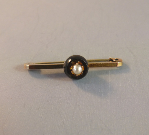 VICTORIAN 9 carat yellow gold and banded agate bar pin in black and white with prong set half pearl, 1-1/2″ wide. This is a wonderful versatile piece of jewelry and it is in excellent condition. It could also be a conversion piece, where your jeweler could attach a chain so it could be worn as a pendant. … Continue reading “VICTORIAN 9 carat yellow gold agate bar pin”