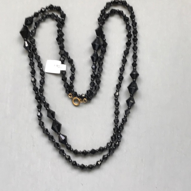 VICTORIAN black glass beads necklace with smaller conical shaped beads and faceted round ones, 40″ long. This can be worn as a single strand or doubled. Hand tied knots between the beads is a sign of quality. View #V40662 $98.00