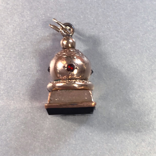 VICTORIAN yellow gold tone metal 4-sided wax seal watch fob with a black warrior’s head intaglio on the bottom and a red rhinestone on each of the four sides, 5/8″ by 1/2″. I particularly enjoy the interesting shape of it. View View View View View #V40893 $148.00