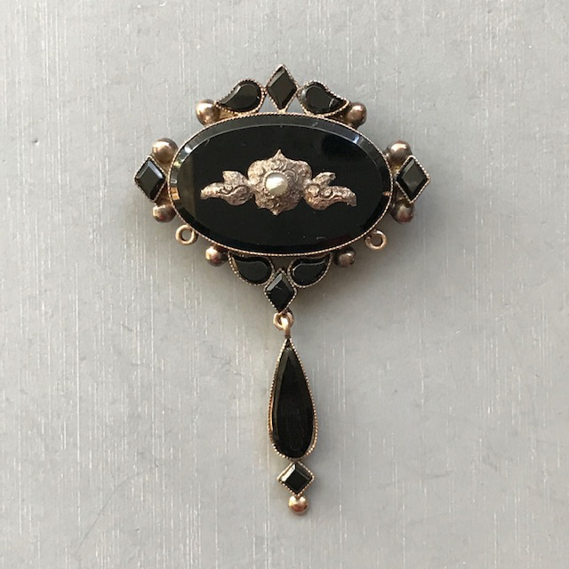VICTORIAN black glass mourning brooch with a flower and leaves center and a seed pearl, symbolic of a tear of sadness, from the late 1880s. The total length is 2″ and it is 1-1/3″ wide. View View #V42342 $58.00