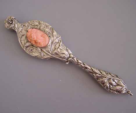 VICTORIAN antique sterling and carved angel skin coral cameo lorgnette, very rare style with heavily and ornately embossed floral motif with a poppy on the reverse, 5-1/3″ by 1-1/3″. These no longer pop open as they should, but need to be prized a bit to open, and there is a shallow dent on the handle, so this … Continue reading “VICTORIAN sterling & coral cameo lorgnette”