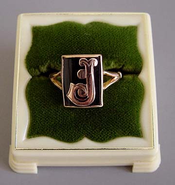 VICTORIAN ring 9 karat yellow gold and black ring with the applied initial “J” on the front, circa 1890, size 6-3/4. Similar rings are in the E.V. Roddin Catalogue, 1887-1889 where it describes some of them as, “Fine solid gold and stone rings. Onyx, Intaglio, Cameo, Amethyst, Blood Stone, Tiger Eye”. The box shown is for display … Continue reading “VICTORIAN ring 9k gold & black ring initial “J””