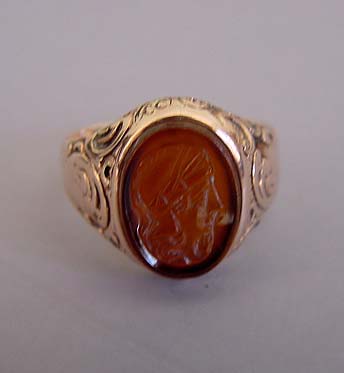 VICTORIAN 9k signet ring with an intaglio carved sard in a 9 karat rose gold setting, circa 1890, size 6-3/4 and 1/2″ along the finger, total weight 0.11 ounces. Sard is reddish brown form of chalcedony, seen in a good many Victorian pieces. The cameo is of a Roman warrior profile. This is a lovely … Continue reading “VICTORIAN 9k rose gold signet ring intaglio sard, Roman warrior profile”