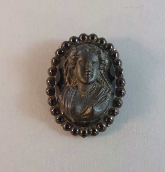 VICTORIAN molded black vulcanite on glass cameo brooch with beaded edging, signed on the back “W.P.”, circa 1880, 1-5/8″. It is rare to see pieces like these signed and I don’t know who these initials stand for. The lady wears a veil and a double strand of beads, and all around her are scallops, followed by … Continue reading “VICTORIAN vulcanite, glass cameo brooch, signed”