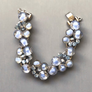 BRACELET of glowing glass moonstone cabochons and aqua blue rhinestones in a gold tone setting