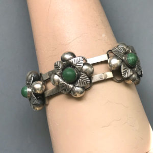 ARTS and CRAFTS style rare hammered sterling silver bracelet with green enamel centers and etched designs on the links