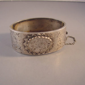 VICTORIAN antique sterling silver hinged bangle with four stacked and beaded edges, an etched scroll and leaves center, hallmarked 1883