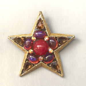 STAR shaped very special brooch with brilliant red, aqua and plum aurora borealis and textured blue rhinestones